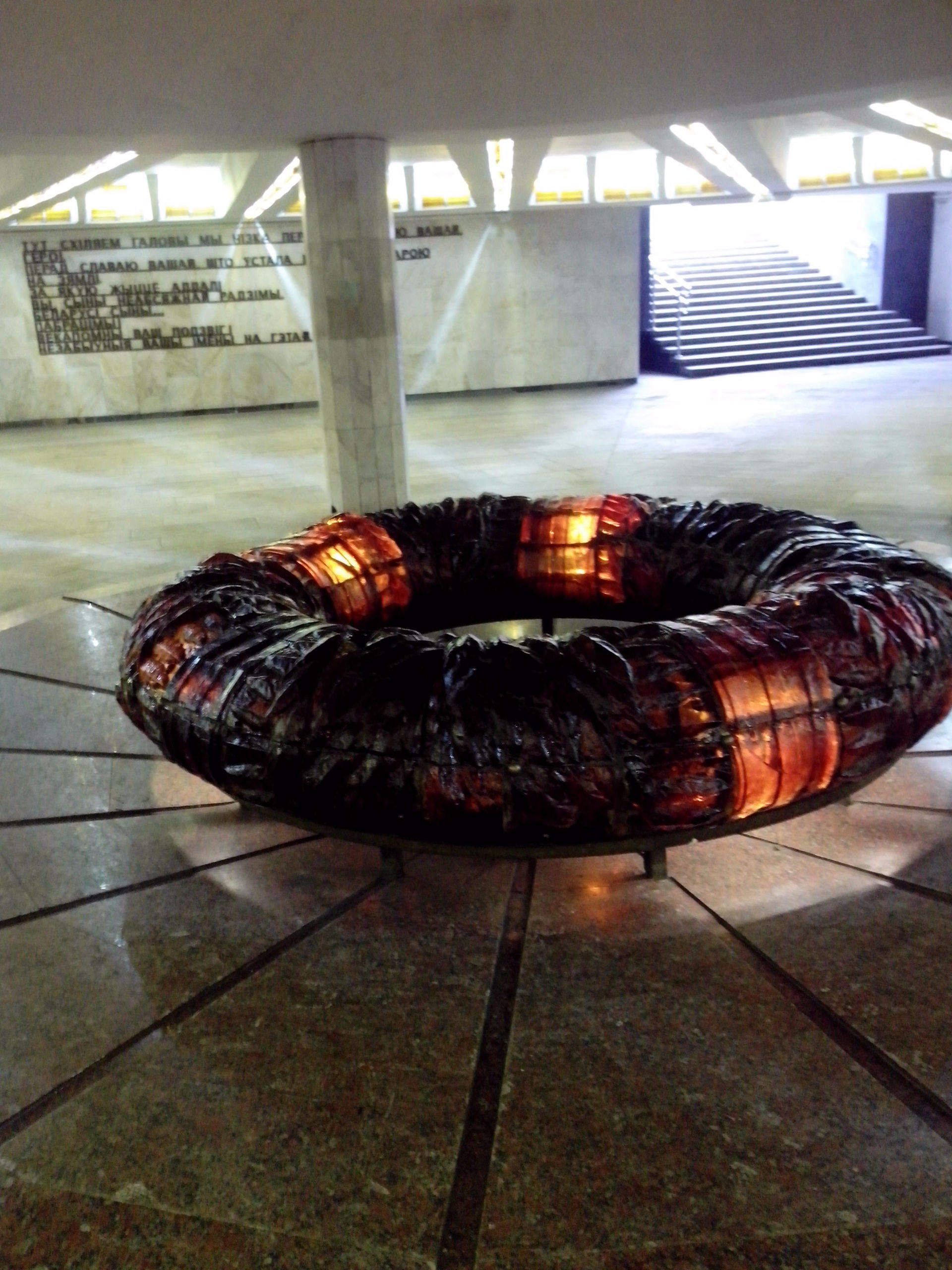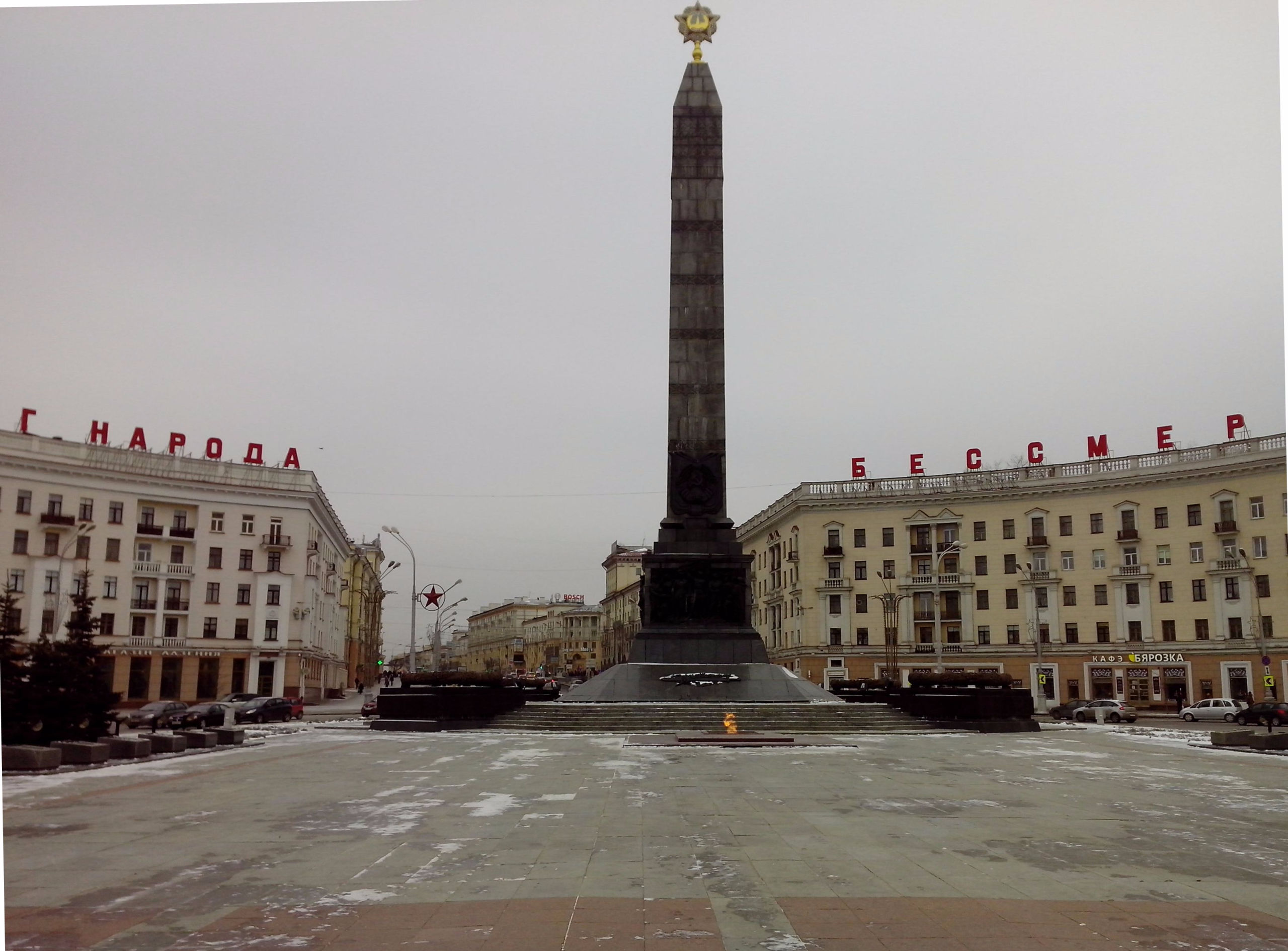 Площадь Победы, под памятником — вход в станцию метро, магазины сувениров, но самое главное — как бы дымящийся, тлеющий венок, а по стенам — мемориальные доски с именами всех Героев Советского Союза, уроженцев Беларуси.