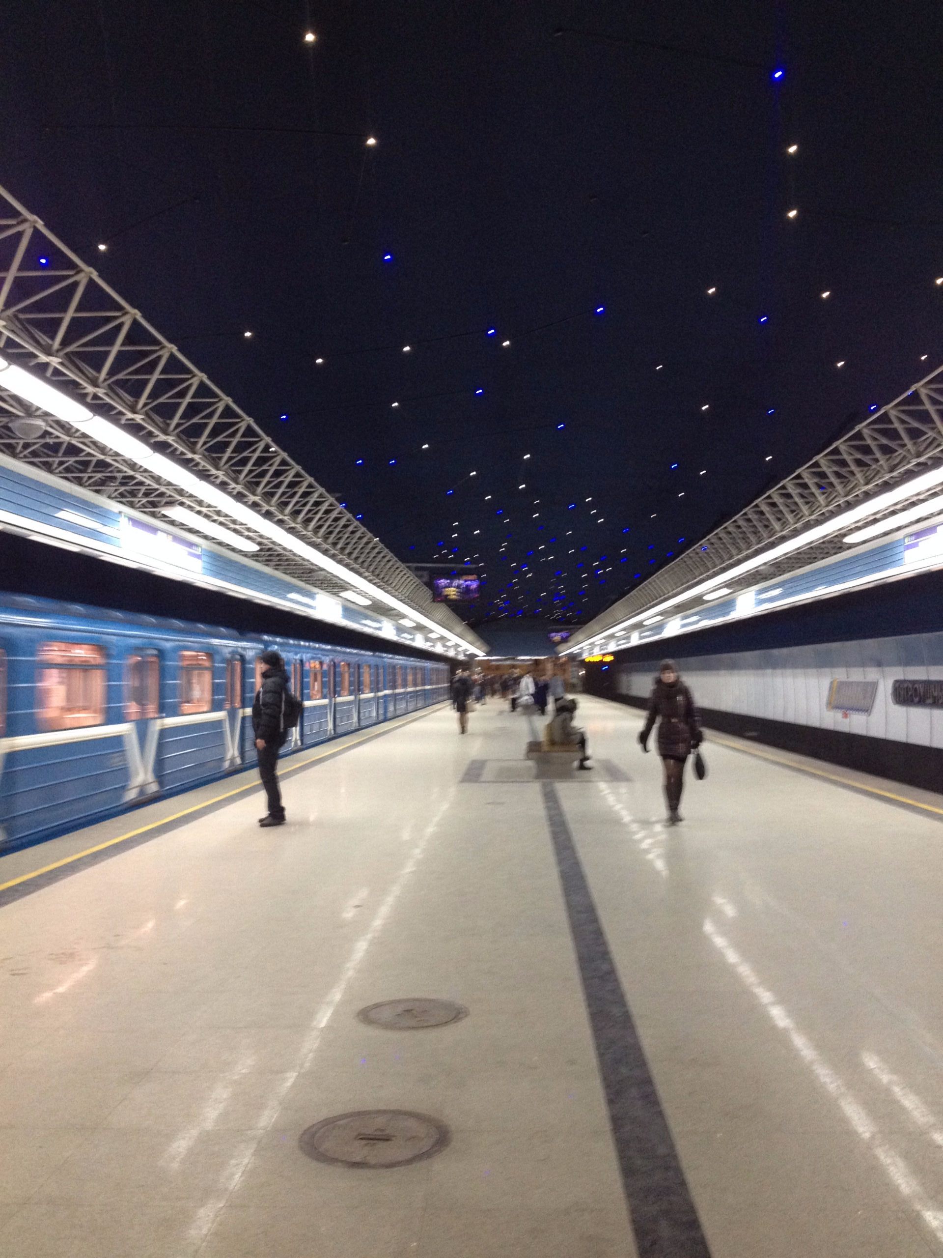 Не очень четкое фото, но я просто обалдела! Это не перрон поезда под открытым неббом, это одна из станций Минского метрополитена! Такое вот звездное небо под землей!